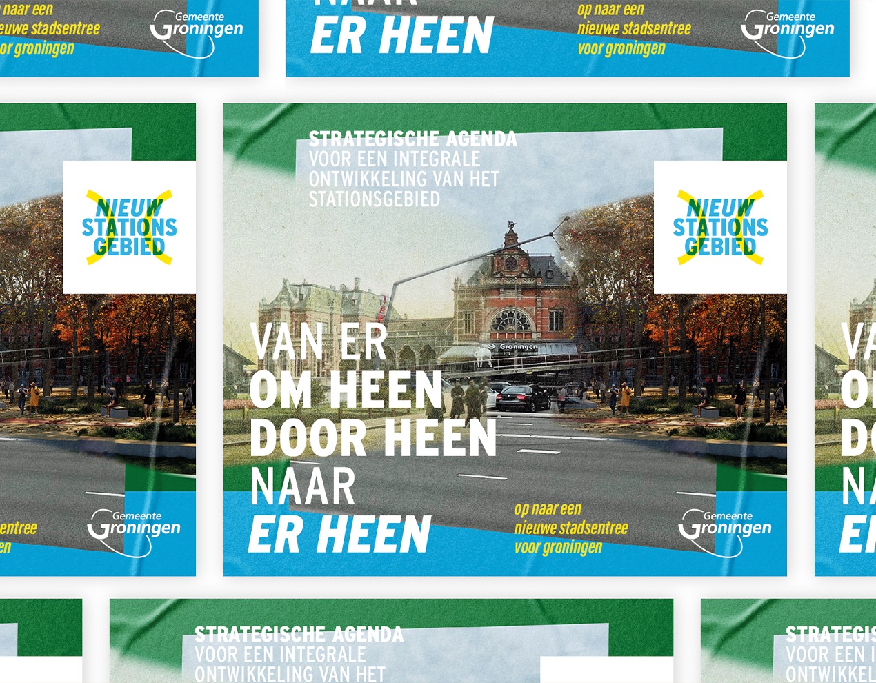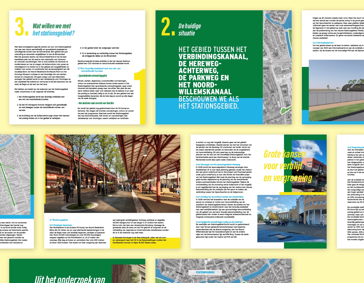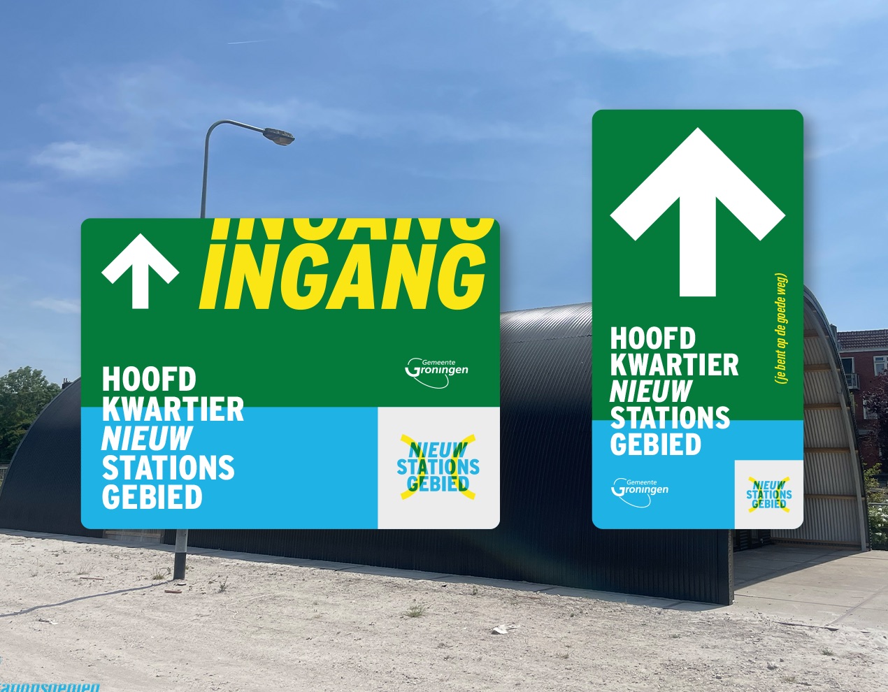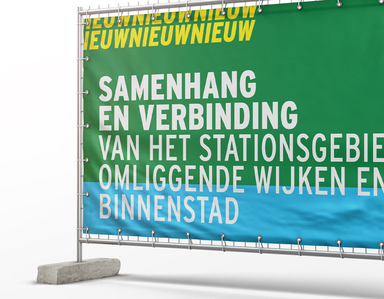 Al jaren op de schop en nog jaren in de steigers. Geen in of uitgang (meer), maar een (onder)doorgang. Een plek waar reis en verblijf samenkomen met groen en water. Een beeldmerk waarin doorgang centraal staat. Of het nu een brug of een tunnel is. Het gaat over een plek waar alle vormen van vervoer aankomen of juist vertrekken. Een entree naar een stationsgebied in ontwikkeling, in nauwe samenwerking met aangrenzende wijken en zelfs snode plannen voor een nieuwe (Ooster)poort. Noor Wit, Roelien Venema en Claudia Mulder-Otten van de Gemeente Groningen vroegen mij voor het ontwerp van een ontwikkelings-huisstijl. Een manier van communiceren voor alles wat er de komende jaren gaat gebeuren rondom het nieuwe stationsgebied. Een visuele identiteit in logo, typografie, visuals en beeldtaal. Een stijl die ontwikkeling en bouw uitstraalt. Een gebied waar je niet meer alleen langs komt, vertrekt of eindigt. Maar een plek om te verblijven.