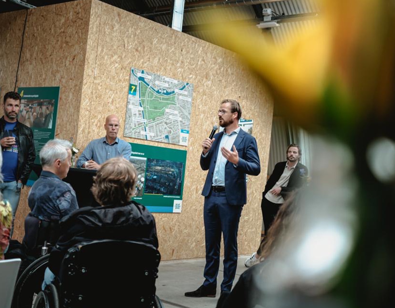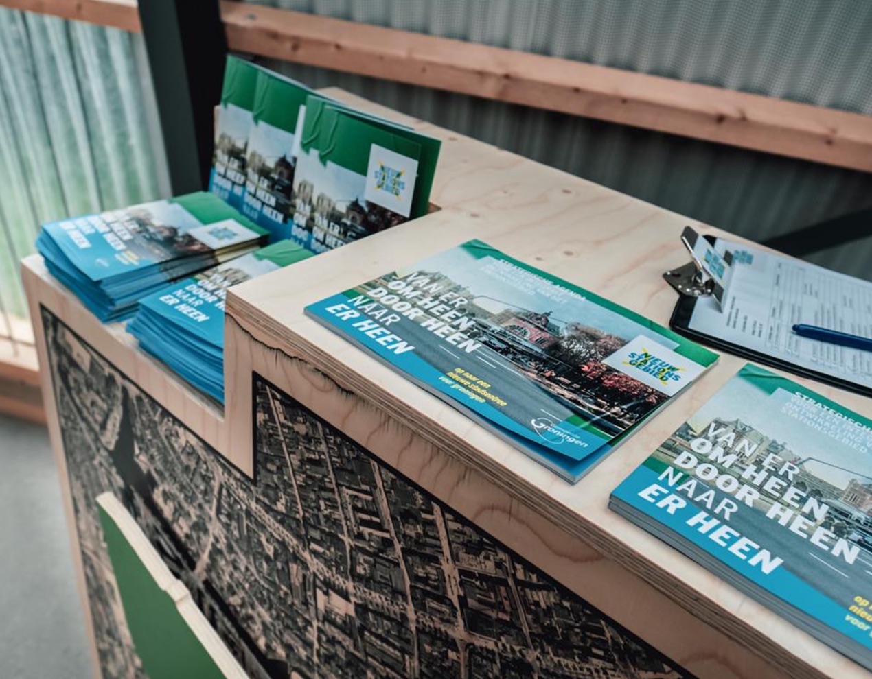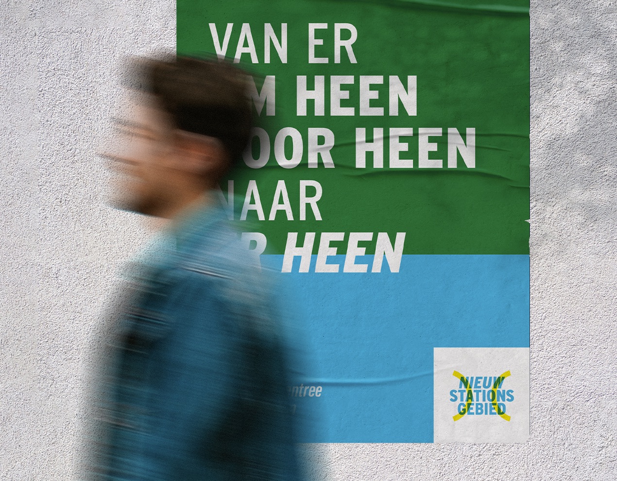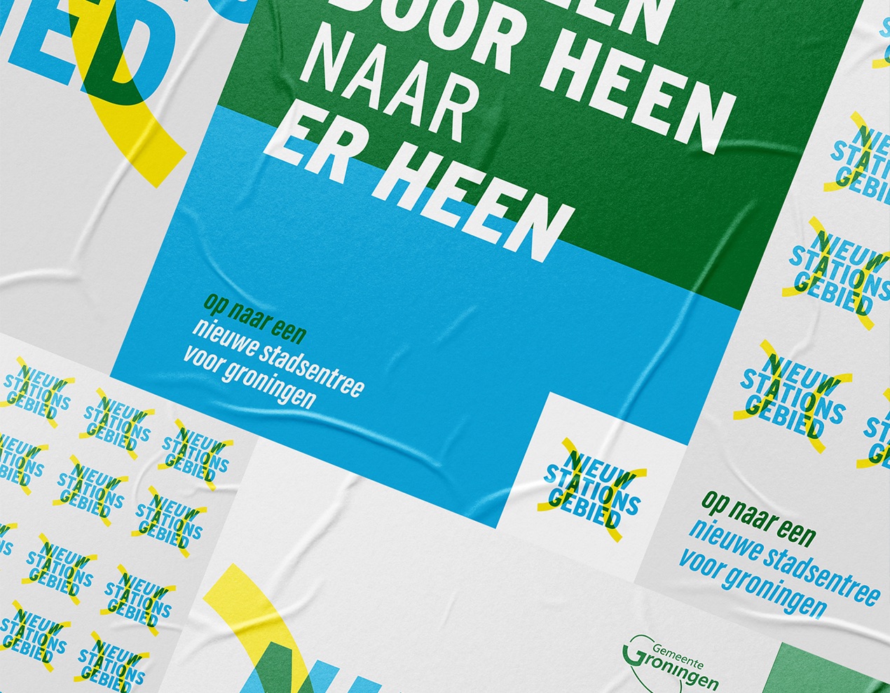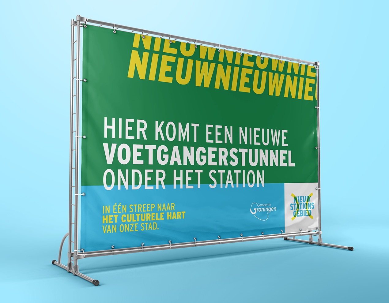 Al jaren op de schop en nog jaren in de steigers. Geen in of uitgang (meer), maar een (onder)doorgang. Een plek waar reis en verblijf samenkomen met groen en water. Een beeldmerk waarin doorgang centraal staat. Of het nu een brug of een tunnel is. Het gaat over een plek waar alle vormen van vervoer aankomen of juist vertrekken. Een entree naar een stationsgebied in ontwikkeling, in nauwe samenwerking met aangrenzende wijken en zelfs snode plannen voor een nieuwe (Ooster)poort. Noor Wit, Roelien Venema en Claudia Mulder-Otten van de Gemeente Groningen vroegen mij voor het ontwerp van een ontwikkelings-huisstijl. Een manier van communiceren voor alles wat er de komende jaren gaat gebeuren rondom het nieuwe stationsgebied. Een visuele identiteit in logo, typografie, visuals en beeldtaal. Een stijl die ontwikkeling en bouw uitstraalt. Een gebied waar je niet meer alleen langs komt, vertrekt of eindigt. Maar een plek om te verblijven.